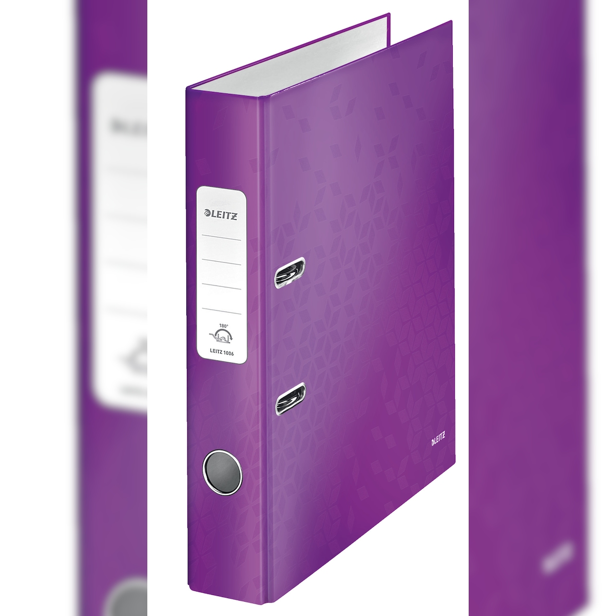 LEITZ Ordner WOW A4, 50mm Rücken, violett. Brillante WOW Farben. 180° Ordner Präzisionsmechanik. Aufgeklebtes Rückenschild. Maße: 318 x 285 mm.