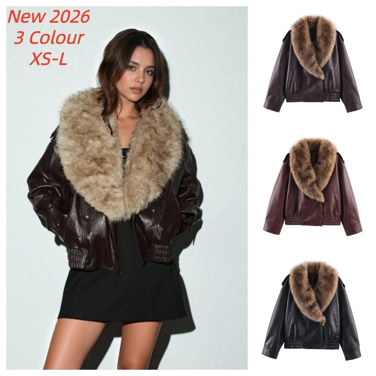 2026 Winter Women Loose Faux Leather Jacket Fashion Removed Big Fur Collar Causal Coat High Street Double Breasted Outwear cm white