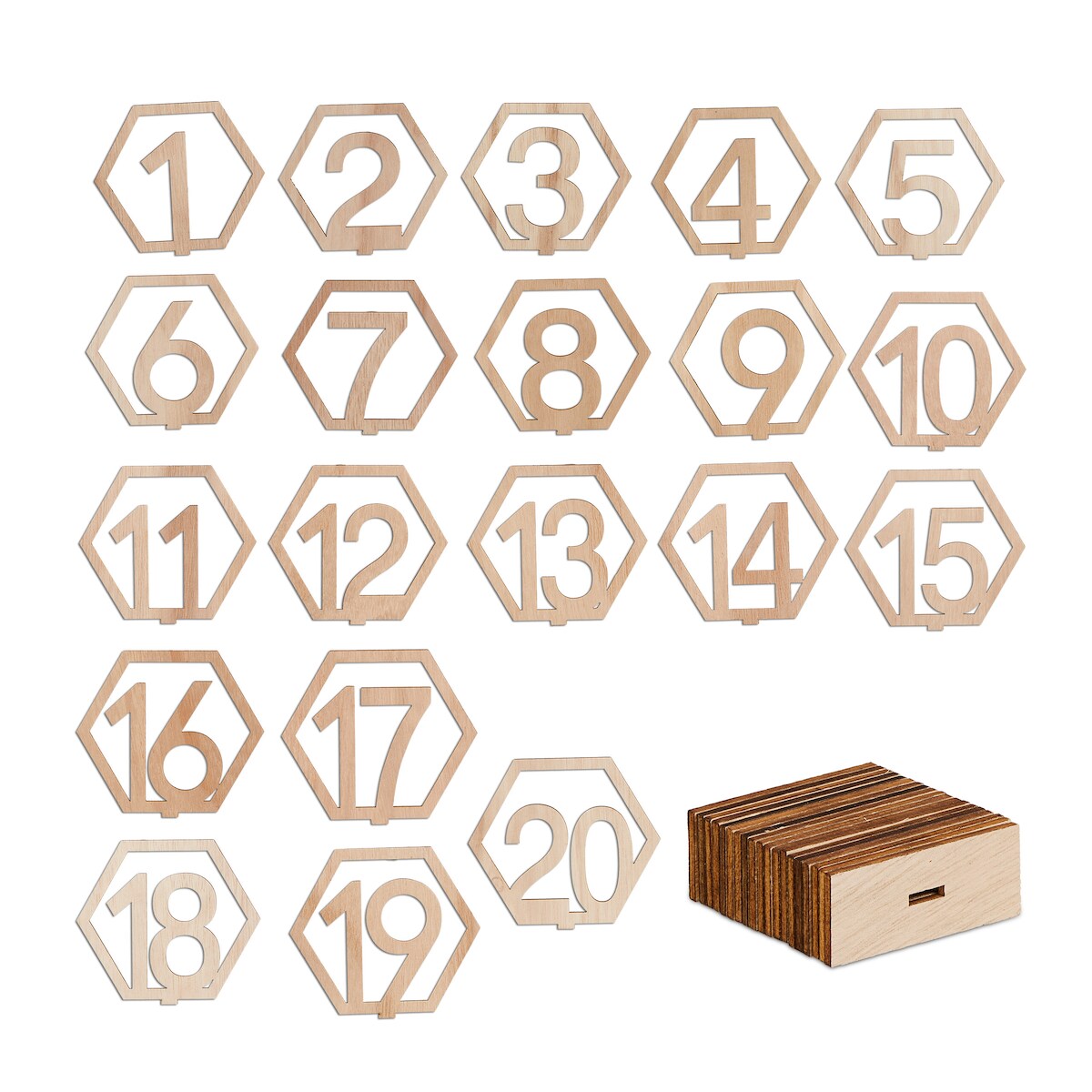 Relaxdays Tischnummern Hochzeit, Zahlen 1–20, HBT: 10x11x2,5 cm, Feste u. Gastronomie, Tischnummernschilder Holz, natur