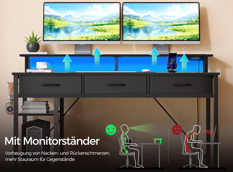 Rolanstar computertisch mit USB-anschlüssen, stromsteckdosen, LED-streifen, schubladen & aktenschrank, beidseitig montierbarer gaming-ecktisch mit monitorablage & stauraum für das homeoffice