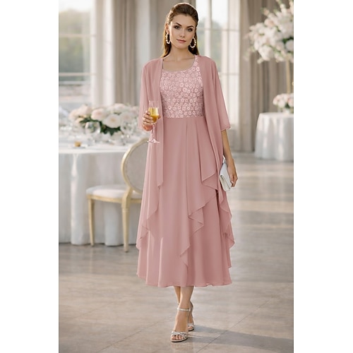 Due Pezzi Tubino Colonna Lunghezza al ginocchio Abito da invitata a nozze Abito da cerimonia per signora Manica 3/4 Collo gioiello Elegante Ospite di nozze Chiesa Chiffon Raso Pizzo Abiti Corti con
