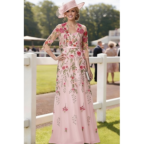 Linea ad A Lunghezza al pavimento Abito da invitata a nozze Abito da cerimonia per signora Manica 3/4 Scollo a Cuore Elegante Formale Derby del Kentucky Semi-Formale Pizzo Abiti Corti con Giacca con