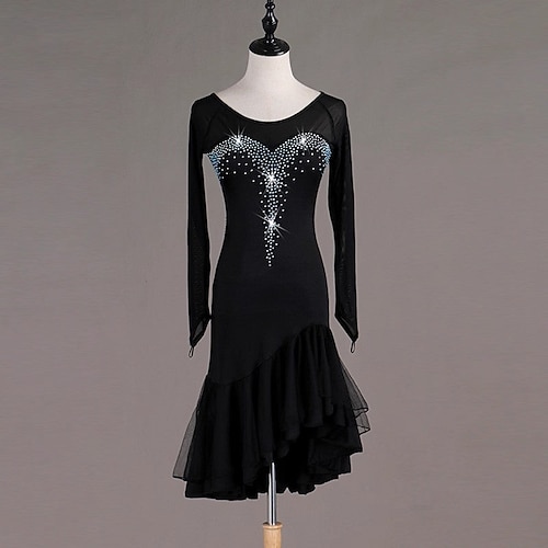 abito da ballo latino da donna con strass neri - abito da ballo asimmetrico con volant in rete a maniche lunghe