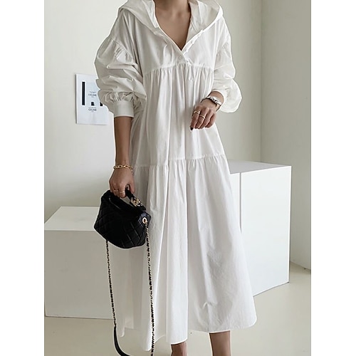 Per donna Nero Bianco Kaki Autunno Inverno Abito maxi Abito Bianco Abiti in cotone e lino Abito Camicia Moda Essenziale Classico Quotidiano All'aperto Vacanza Vestibilità comoda Semplice Con Cappuccio