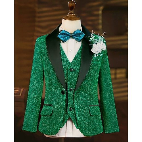 5 Pezzi Completo da paggetto Ragazzi Bambini Abito Blazer, pantaloni e cravatta Casuale All'aperto Feste Moda Cool Essenziale Tinta unica Paillettes Tasca Bottoni Verde Poliestere