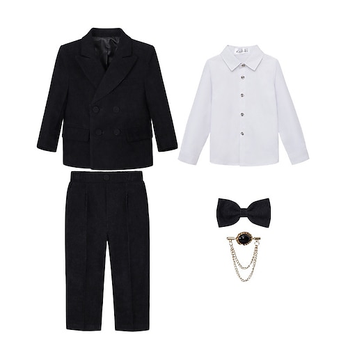 Completo da fedi per bambini, 5 pezzi, blazer pantaloni camicie cravatta ragazzo abito formale casual esterno festa moda fresco basic tinta unita tasca bottoni nero vino viola poliestere