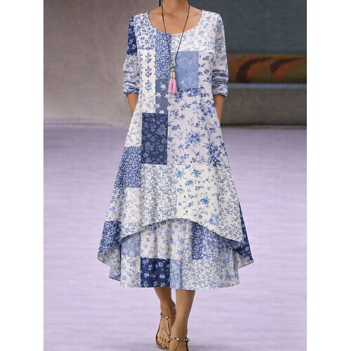 Per donna Blu Bianco Viola Estate Primavera Abito Midi Finto cotone e lino Abito Bianco Moderno Quotidiano Weekend Vestibilità comoda Floreale Scollo a V