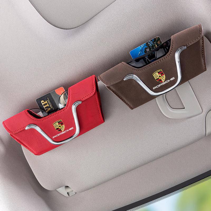 Auto Sonnenblende Brillenbox Sonnenbrillenclip Karten-Ticket-Halter Ständer Für Porsche Boxster Cayenne Panamera Macan Cayman 911 918 996 917 991 brau
