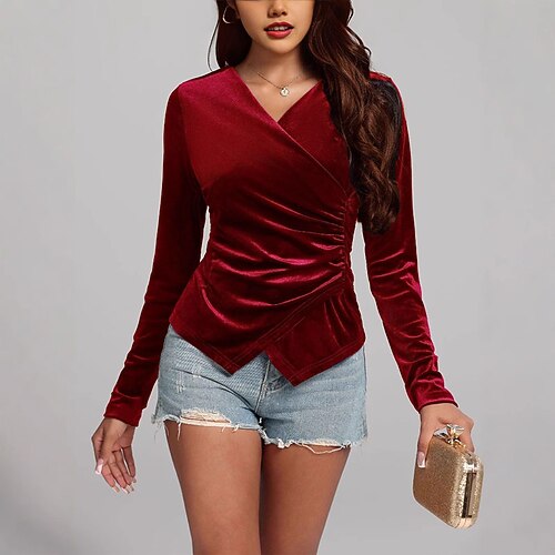 Per donna Velluto Elegant Elegante Blusa Semplice Elegante Manica Lunga Scollo a V Top Regolari Quotidiano Ferie Uscire Arricciato Nero Vino Blu Viola Verde Primavera Autunno