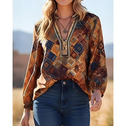 Per donna Blusa Grafico Elegante Manica Lunga Girocollo Top Regolari Quotidiano Ferie Uscire Patchwork Blu Marrone Verde Primavera Autunno