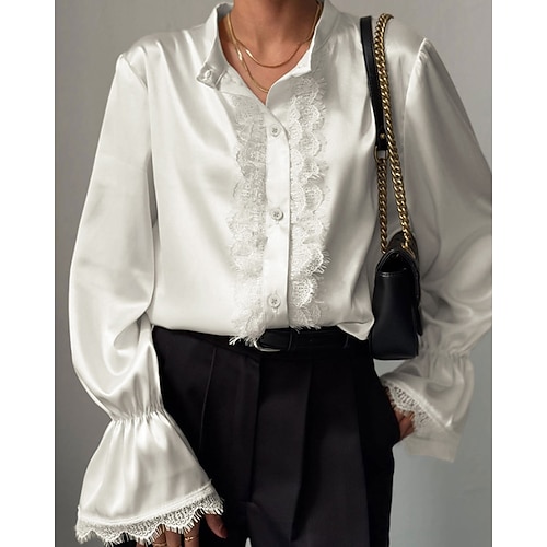 Per donna Camicia Elegant Raso/Satin Blusa Semplice Elegante Manica Lunga Girocollo Top Regolari Quotidiano Ferie Uscire Patchwork Bordo in pizzo Bianco Autunno