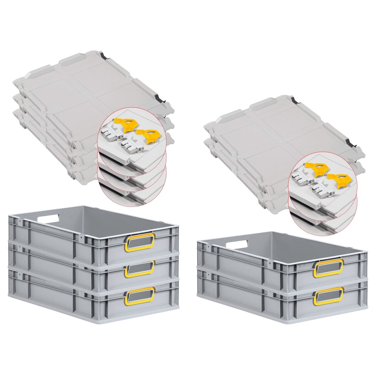 PROREGAL 4x Eurobox NextGen Grip mit Scharnierdeckel & gelben Verschlüssen | HxBxT 22x40x60cm | 44 Liter | Griffe offen | Verstärkter Boden