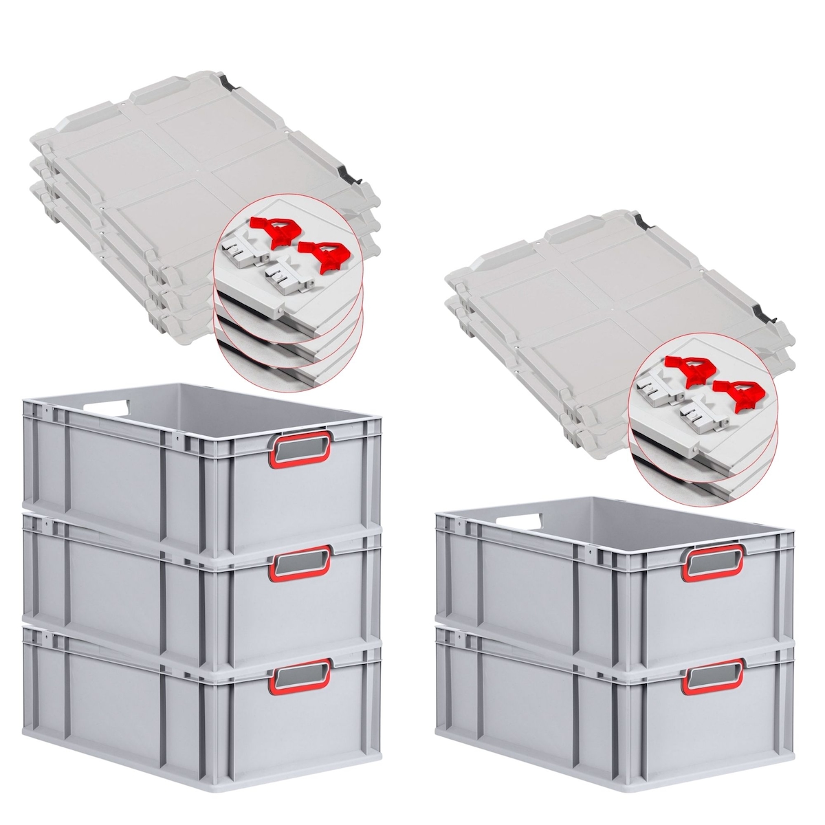 PROREGAL 4x Eurobox NextGen Grip mit Scharnierdeckel & roten Verschlüssen | HxBxT 32x30x40cm | 30 Liter | Griffe offen | Glatter Boden