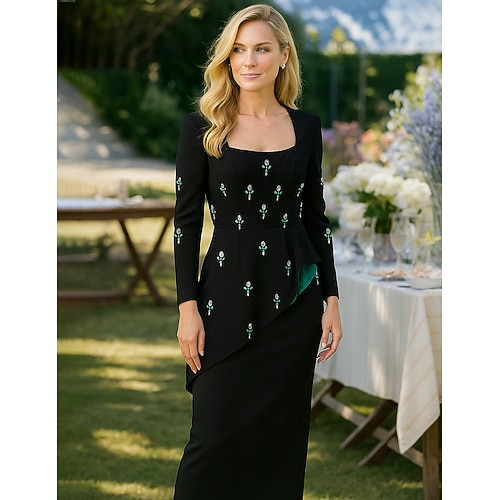 Abito tubo colonna lunghezza pavimento abito nero abito da ballo abito da festa abito madre della sposa manica lunga collo quadrato elegante vintage festa cotone misto con perline balze