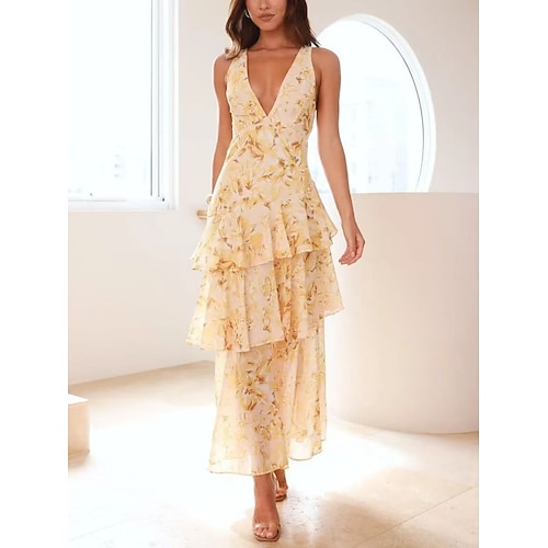 Per donna Abito maxi Abito a trapezio Abito con balze Casual All'aperto Uscire Vestibilità regolare Floreale Senza Maniche Scollo a V Giallo Rosa Rosso Verde scuro Estate Primavera