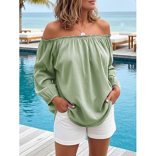 Per donna Camicia Camicie di cotone e lino Camicia di lino Camicia da Spiaggia Volant Semplice Elegante Classico Moderno Manica Lunga Senza Spalle Top Regolari Quotidiano Ferie Abbigliamento mare Blu