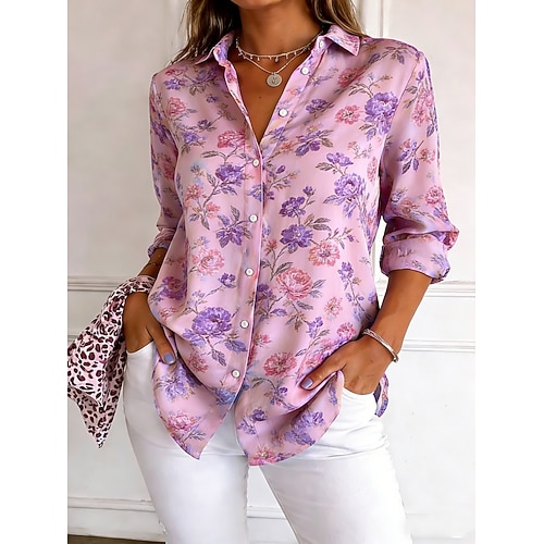 Per donna Camicia Bottoni Stampato Floreale Attivo Quotidiano Elegante Manica Lunga Colletto a Camicia Top Regolari Quotidiano Ferie Nero Primavera Autunno