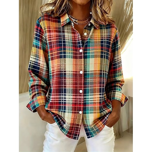 Per donna Camicia Blusa Grafico Geometrico Plaid Vintage Quotidiano Elegante Manica Lunga Colletto a Camicia Top Regolari Quotidiano Patchwork Bottoni Stampato Blu Rosa Marrone Rosa Primavera Autunno