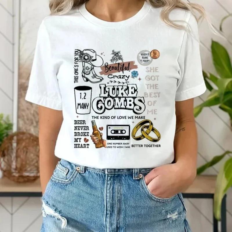Dames T-shirt Luke Combs Beautiful Crazy Doodles Bedrukt Trendy Street Cartoon Patroon Street Casual Dames Top O-Hals T-shir cm