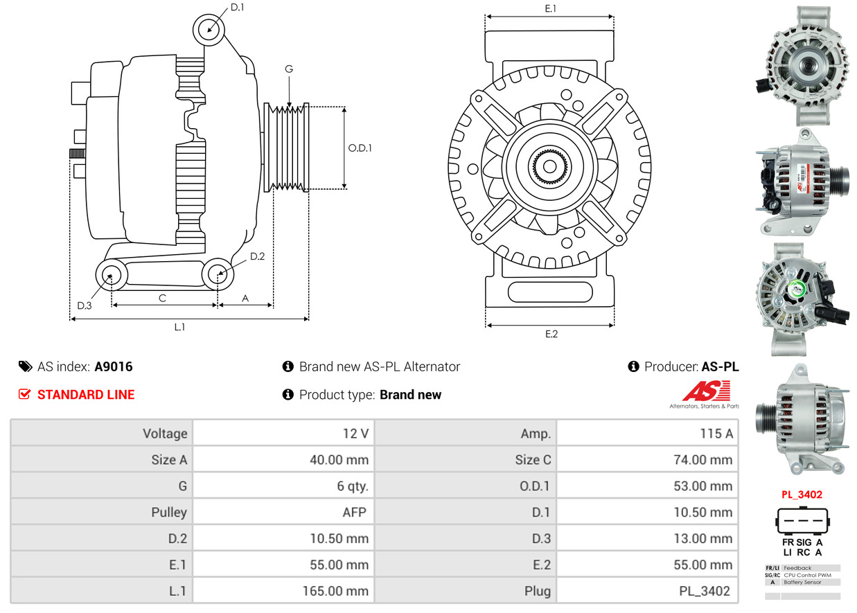 AS-PL Generator A9016 12V 115A für FORD RE1S7T10300CF YC1010300DB 1151213