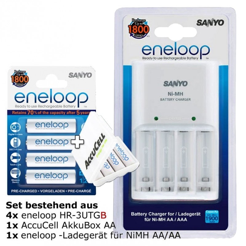 Stecker-Ladegerät weiß mit 4x Panasonic eneloop Standard HR-3UTG und AccuCell Akkubox AA
