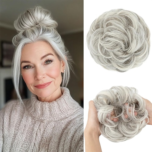 Chignon grande e disordinato, scrunchies ricci e ondulati, chignon sintetico, coda di cavallo, extension per capelli, chignon spesso, per donna, grigio multi