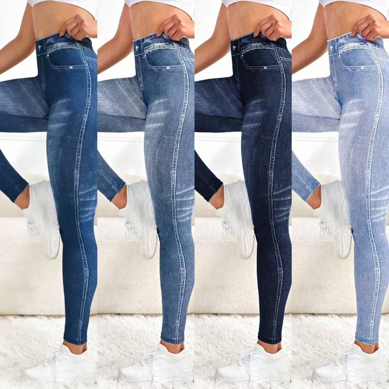Women Sport Yoga Leggings Faux Denim Jeans Skinny Tight Seamless Fitness Butt Liftting Outerdoor Pants cm blue