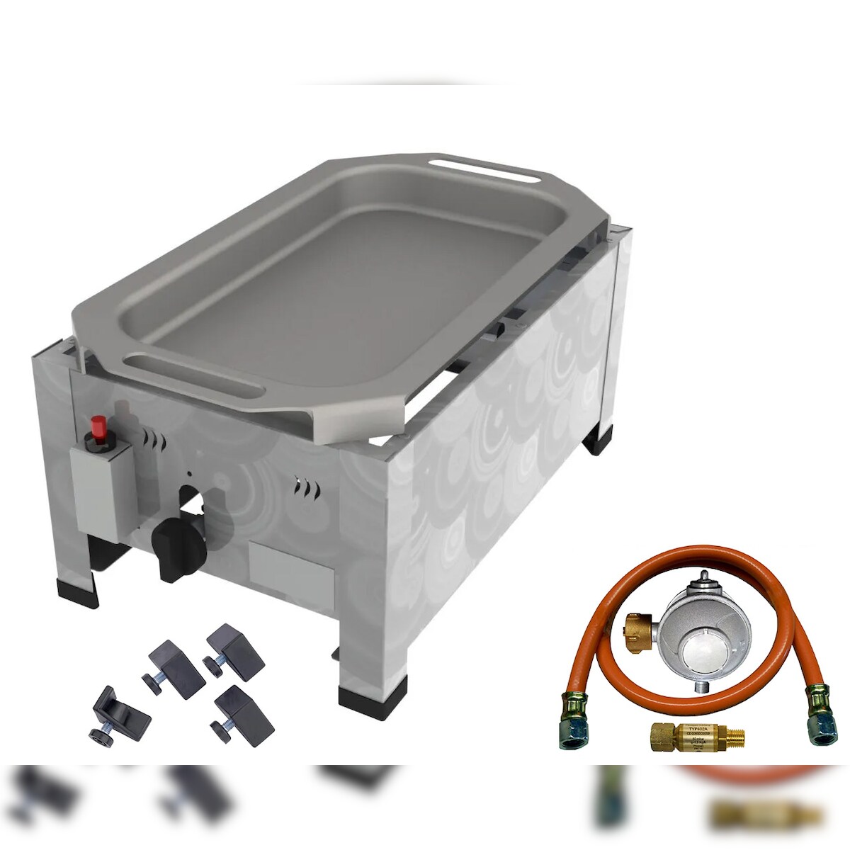 ChattenGlut ChattenTec Professional doppelwandiger Gastrobräter 3-flammig Tischgerät 12 kW, Flüssiggas 650x530x280 mm mit Gewerberegler und Rost und Pfanne
