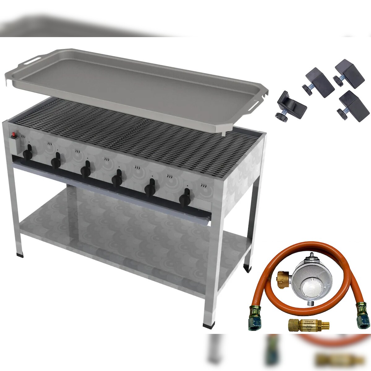 ChattenGlut ChattenTec Professional doppelwandiger Gastrobräter 6-flammig Standgerät 24 kW, Flüssiggas 1145x530x830 mm mit Gewerberegler und Rost und Pfanne
