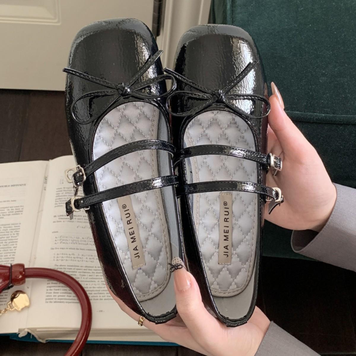 In Stock Rockfish Patent Leather Mary Jane Ballet Flats with Double Strap Bow - Women's Round Toe Low-Cut Shoes cm coffee