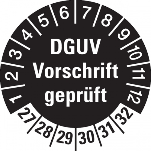 König Werbeanlagen Prüfplakette ab 27, DGUV Vorschrift geprüft, schwarz/weiß, Ø 30 mm - Bogen = 10 Plaketten - 30 mm Folie selbstklebend