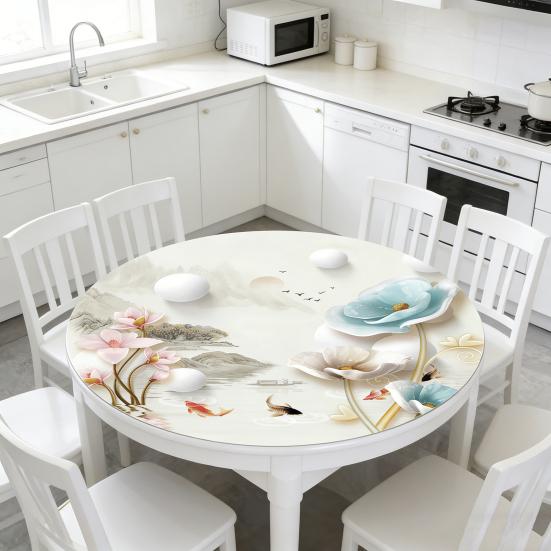 Waterproof Round Tablecloth PVC Oil-proof Table Cover Flower Lotus Leaf Fish Tablecloth Table Protector for Dining Patio Picnic Party Indoor Outdoor