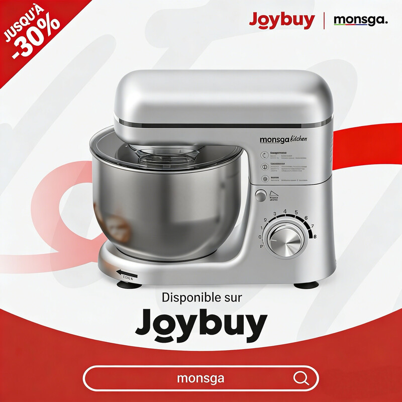MONSGA SM100 Robot pâtissier, 1000 W, noir/argent, bol mélangeur en acier inoxydable 6,0 L, silencieux, avec fouet, crochet pétrisseur, accessoire fouet et couvercle anti-éclaboussures, 8 réglages de vitesse