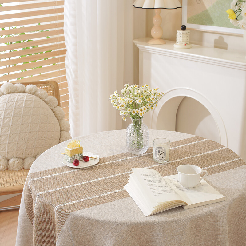 Nappe Rustique en Coton et Lin Antifroissage pour Table Ronde 140 cm – Idéale pour Fêtes, Cuisine, Repas, Vacances, Noël, Motif Lignes Café