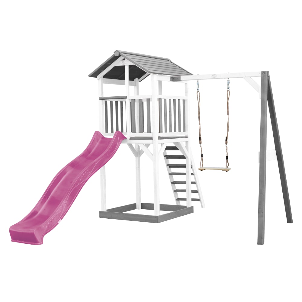 Parco giochi con arrampicata, scivolo viola, altalena, bianco/grigio