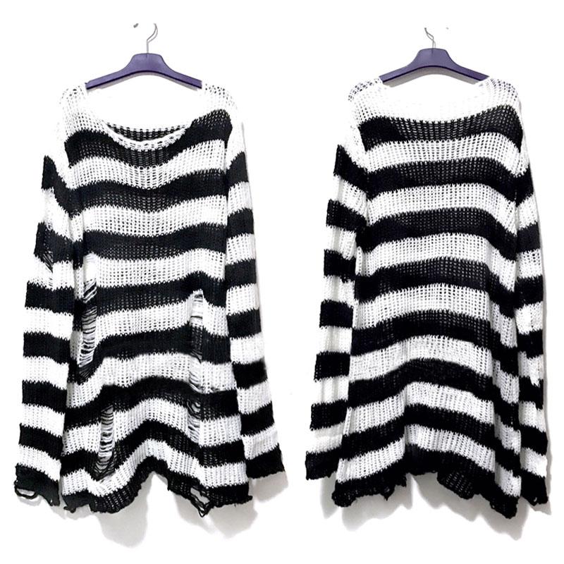 Nowy punkowy gotycki długi sweter unisex letni damski sweter w paski fajny drążą dziurę zepsuty sweter luźny rock cienki ciemny top w stylu streetwear