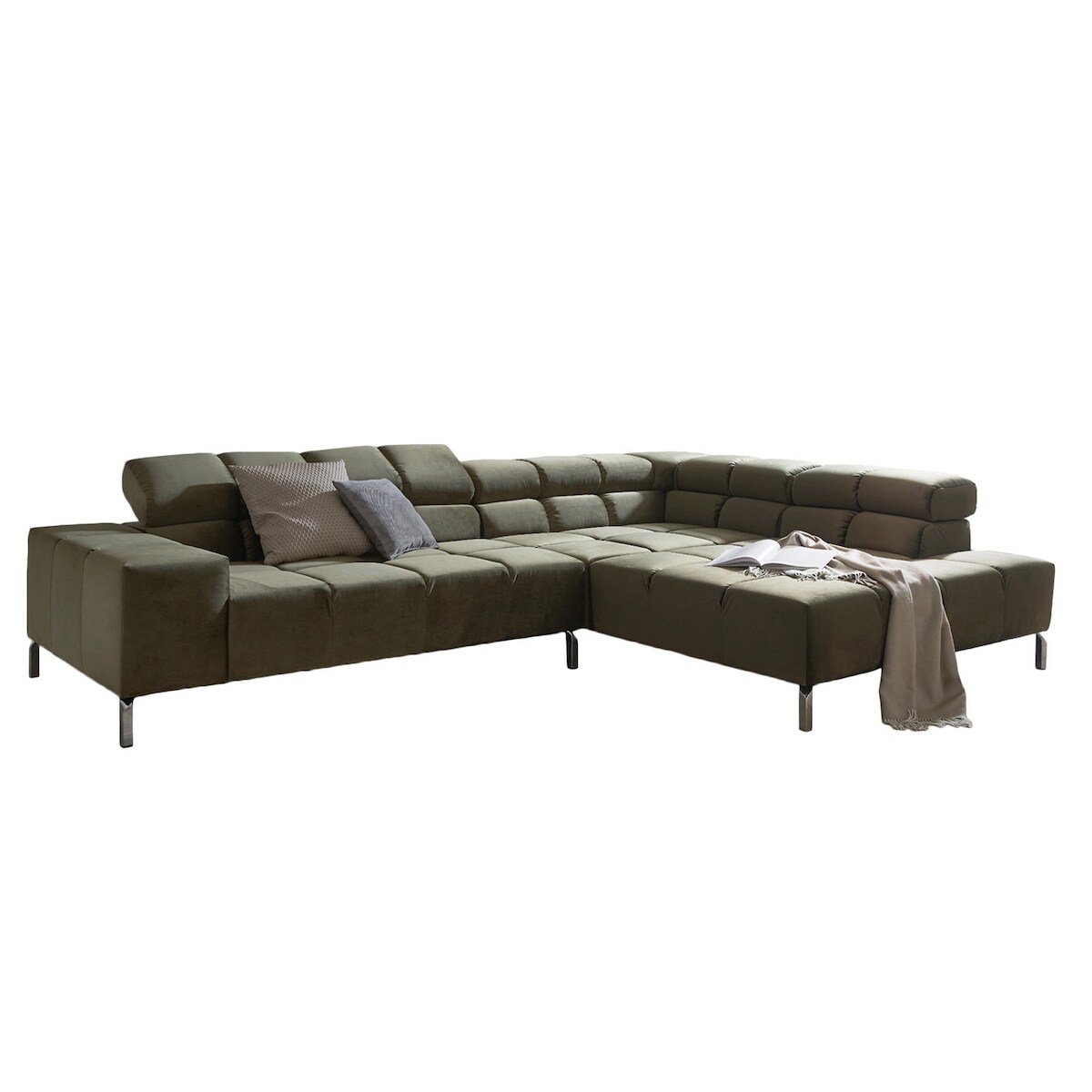 KAWOLA Sofa NELSON Ecksofa Velvet olivgrün Recamiere rechts mit motorischem Sitzvorzug