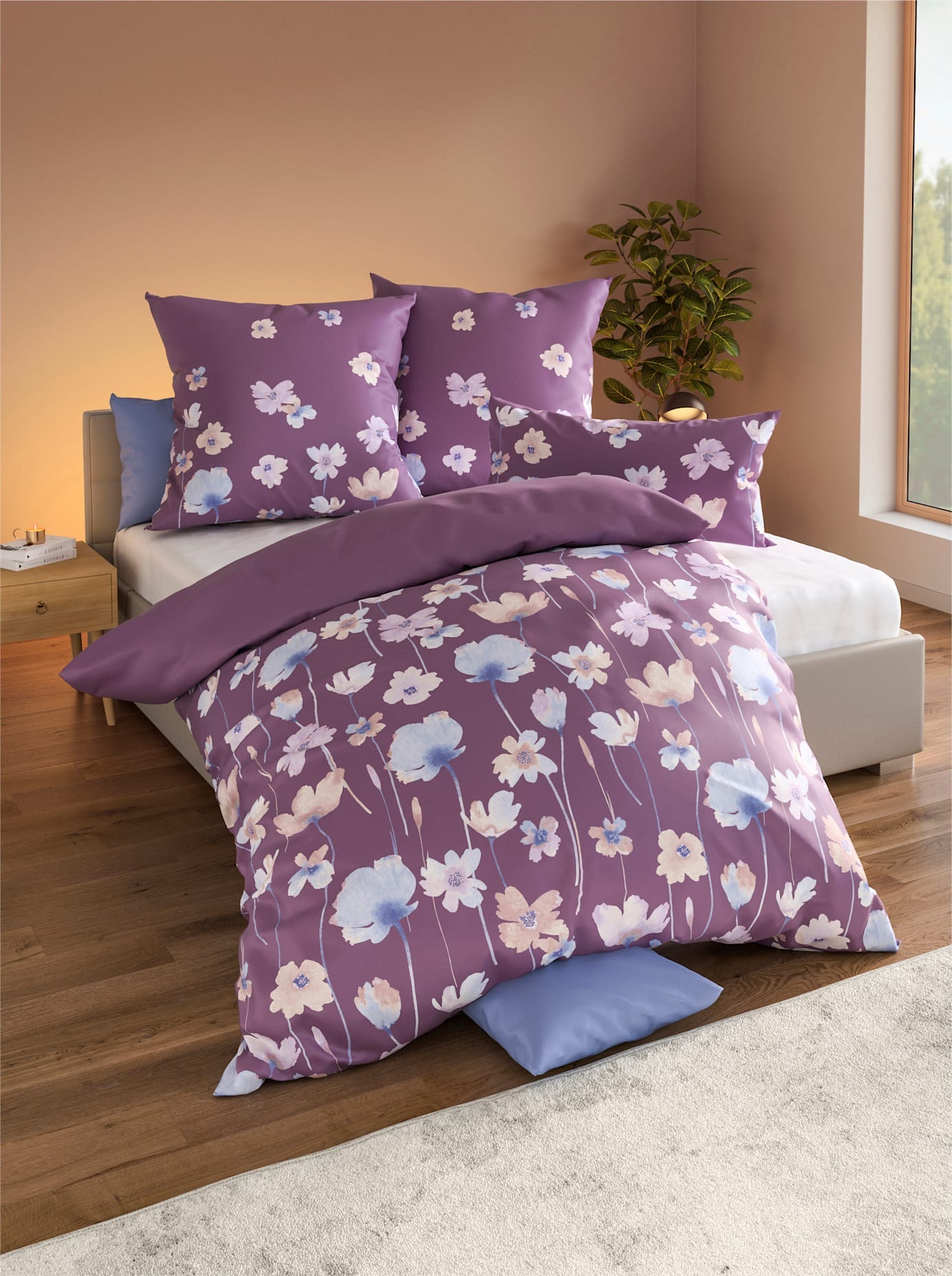 Bettwäsche WÄSCHEPUR Gr. 1, lila (violett, eisblau, bedruckt), B/L: 135cm x 200cm, 2-teilige Garnitur St., 2-teilige Garnitur St., Feinbiber, B/L: 80cm x 80cm, Feinbiber, 100% Baumwolle, Bettwäsche