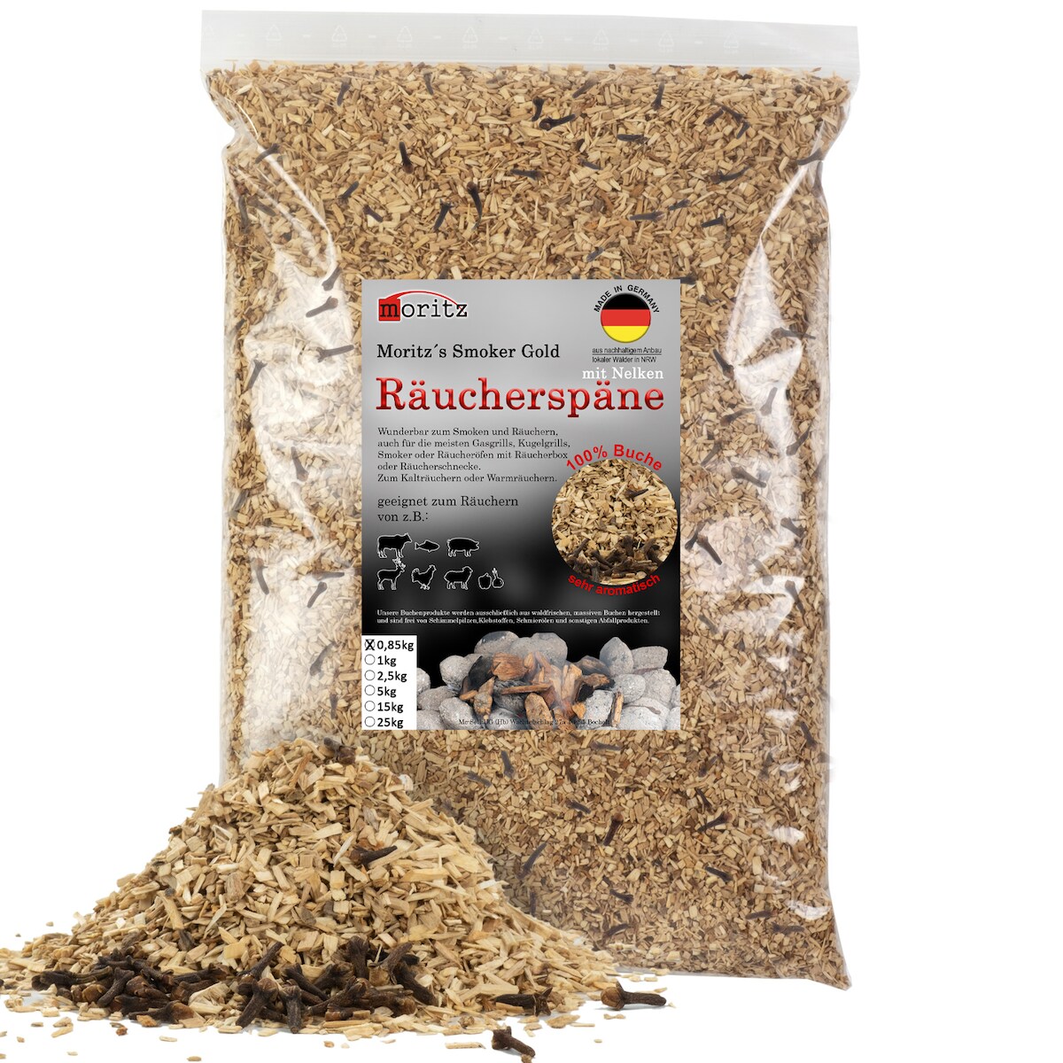 Moritz 0,85kg Räucherspäne Buche mit Nelke fein 0,75 -2 mm Räuchern I Kalträuchern von Fisch Fleisch Wurst Käse auch für BBQ I Grill - Räuchermehl