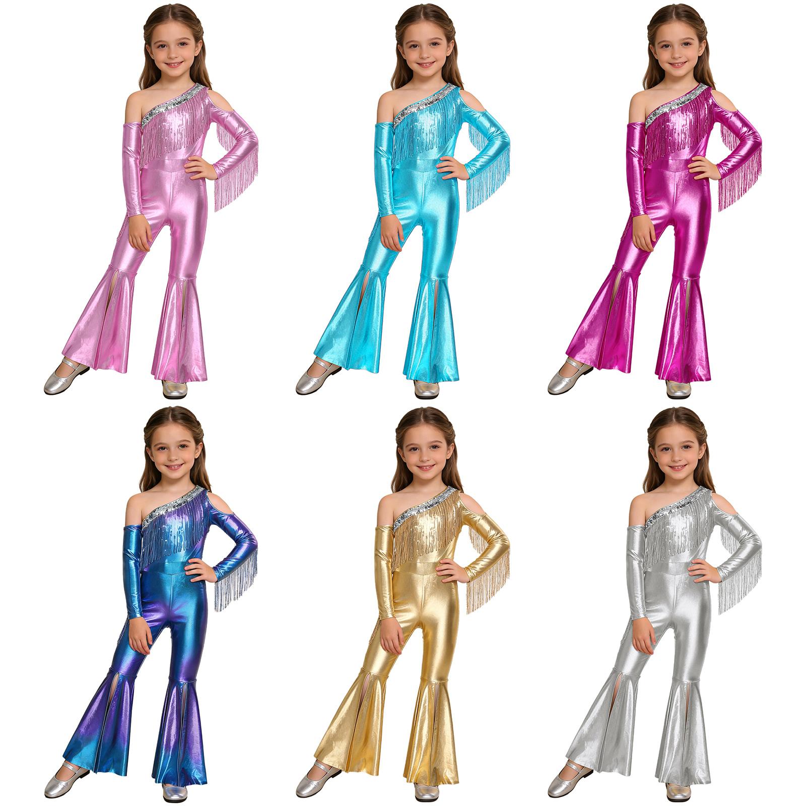 Girls Pageant & Stage Romper: Metallic Shiny Off Shoulder Jumpsuit with Sequin Tassels & Bell Bottom Legs for Disco cm pink