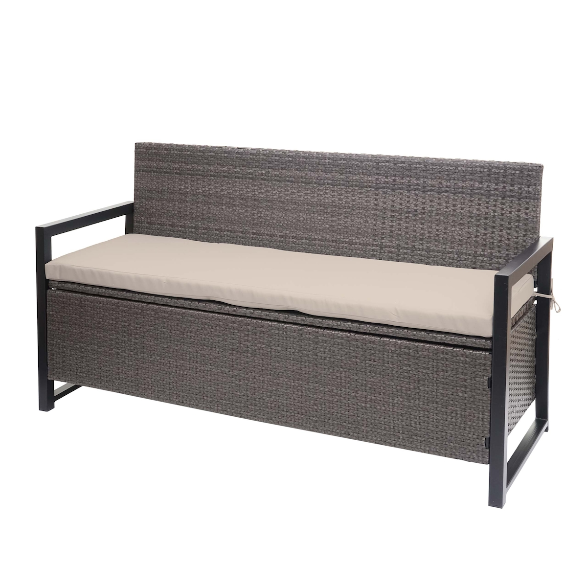 Mendler Poly-Rattan 3er Sitzbank HWC-F39, Gartenbank Truhenbank, Staufach Aufbewahrung Sitzkissen ~ grau-meliert, Kissen beige