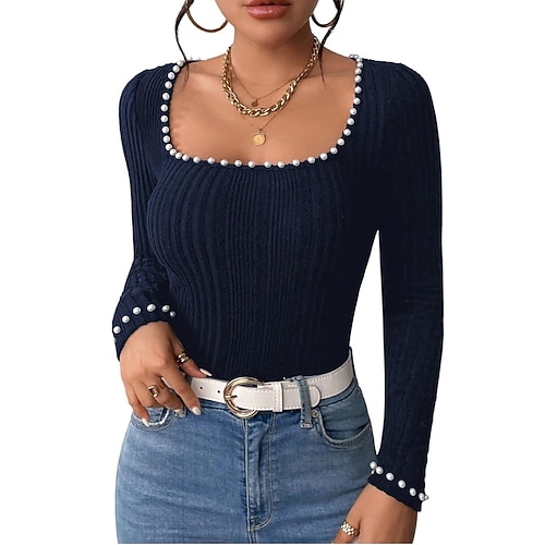 Per donna Maglietta Tinta unica Casual Manica Lunga Collo quadrato Top Regolari Quotidiano Uscire Weekend Patchwork Nero Blu marino Primavera Autunno