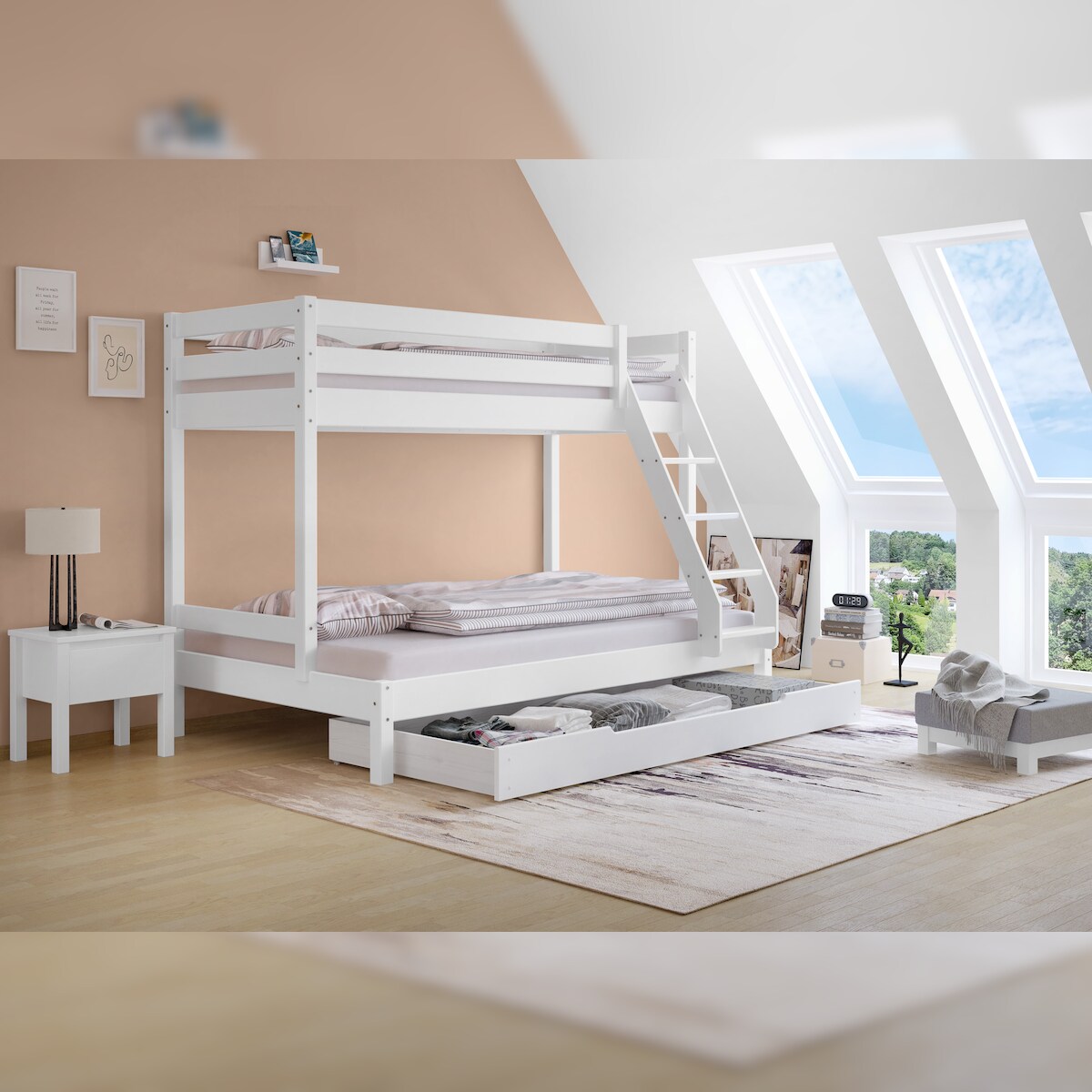 Erst-Holz Doppel-Etagenbett 120x200 und 80x200 Erwachsenen-Stockbett Kiefer Massivholz weiß V-60.18W-08-12 Rollrost und Bettkasten inkl.