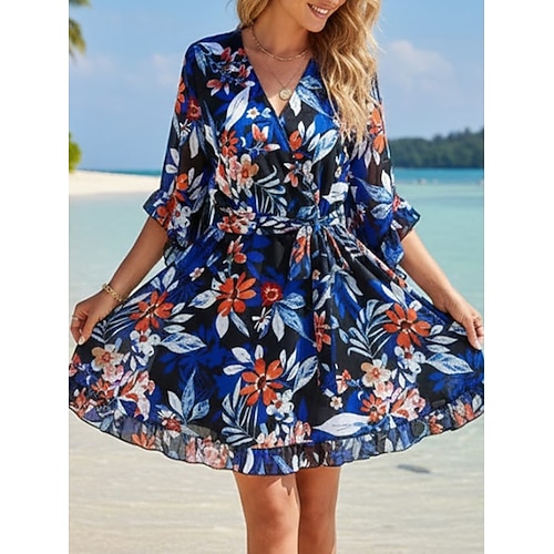 Per donna Mini abito Abito casual Abito estivo Abito boho Moda Informale Da mare Giornaliero Appuntamento Standard Floreale Manica a 3/4 A V Nero Rosso Fucsia Albicocca Estate