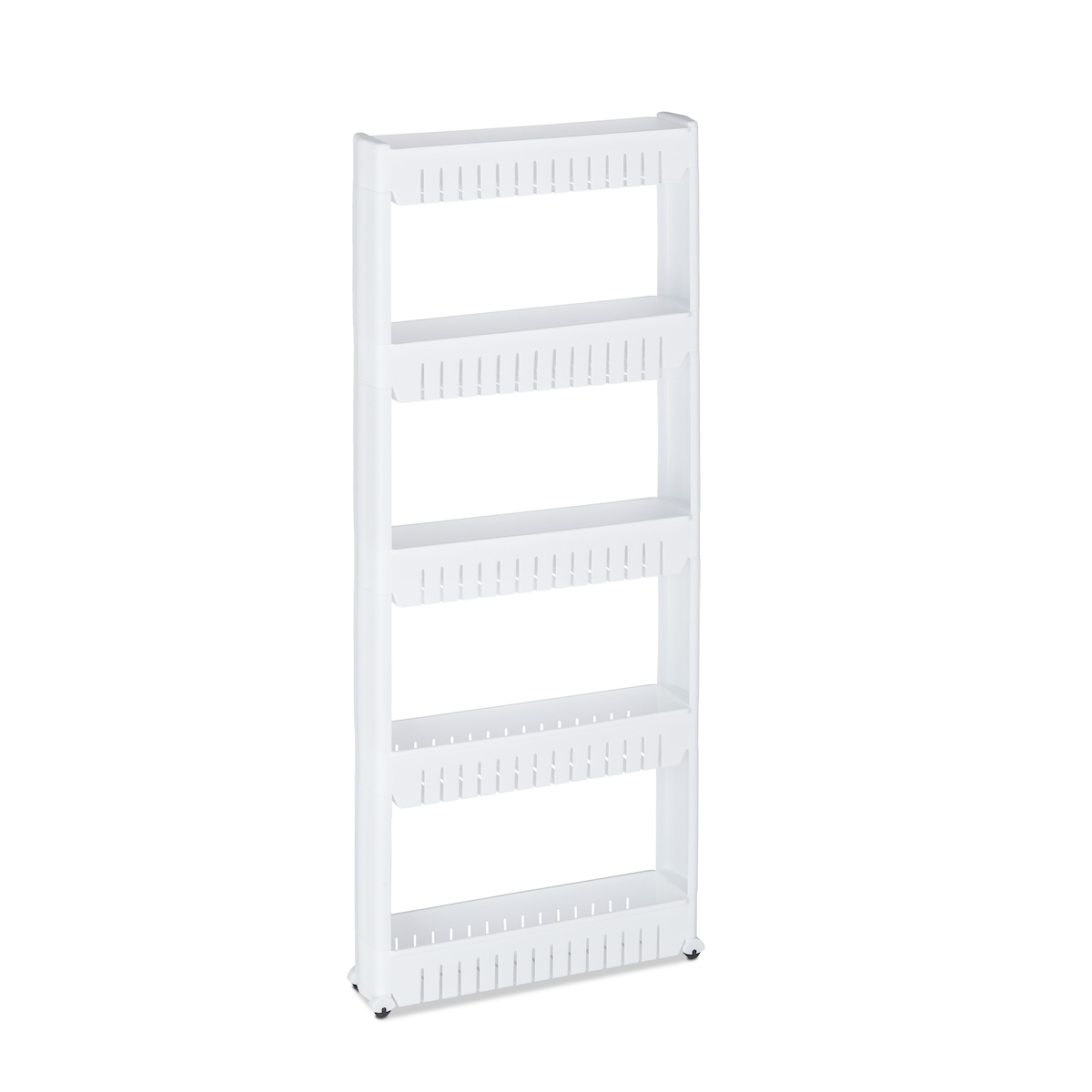 Relaxdays Nischenwagen, 5 Ablagen, schmales Nischenregal für Bad & Küche, HBT 131x12,5x54 cm, Rollregal Kunststoff, weiß