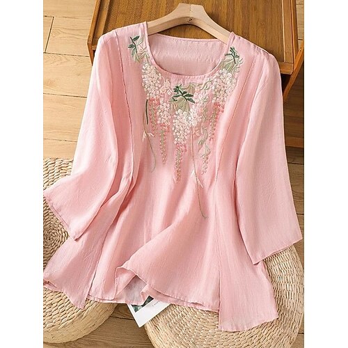 Camicia da donna con bottone giù tunica colletto maniche lunghe grafica piuma elegante vintage tropicale regolare top quotidiano festivi abbigliamento da spiaggia stampa rosa blu arancione verde