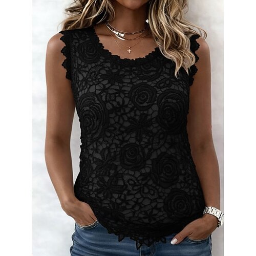 Per donna Camicia con collo camp Tinta unica Elegante Casual Senza Maniche Girocollo Top Regolari Quotidiano Pizzo Patchwork Blu Nero Bianco Rosa Rosso Estate Primavera