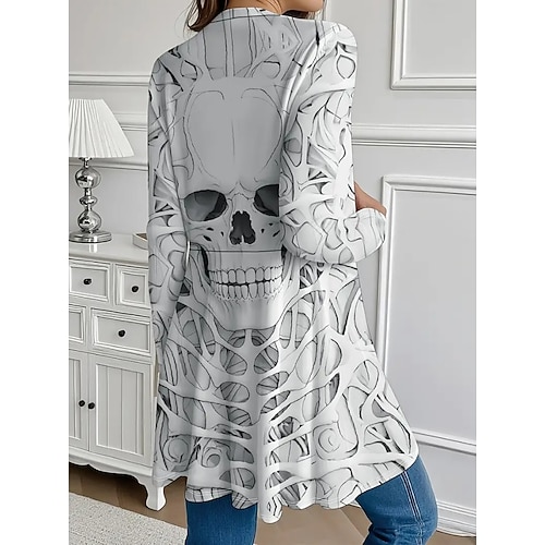 Cappotto da donna leggero confortevole stampa teschi vintage artistica casual casual lungo senza colletto vestibilità regolare a manica lunga outerwear nero bianco marrone primavera autunno