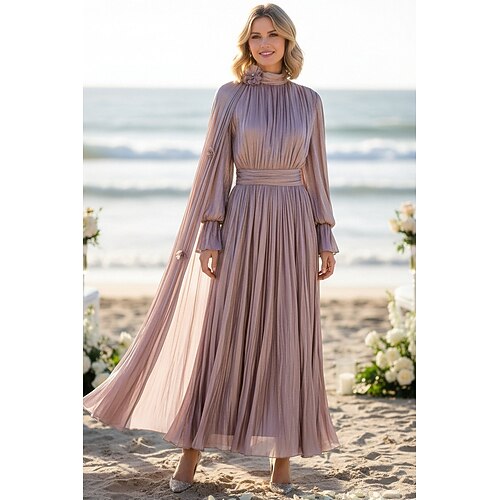 Linea ad A Lunghezza al pavimento Abito Formale Abito da sera Abito a mantella Abiti per invitati a matrimoni Elegante Quotidiano Manica Lunga Collo Alto Formale Shiena scoperta con Fiori 3D Pieghe