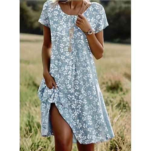 Per donna Mini Abito Vestito T-Shirt Vestito Estivo Abito a trapezio Vacanza Casual All'aperto Spiaggia Uscire Vestibilità comoda Floreale Grafico Manica Corta Girocollo Blu Stampa bianca Bianco e blu